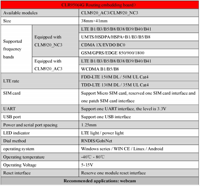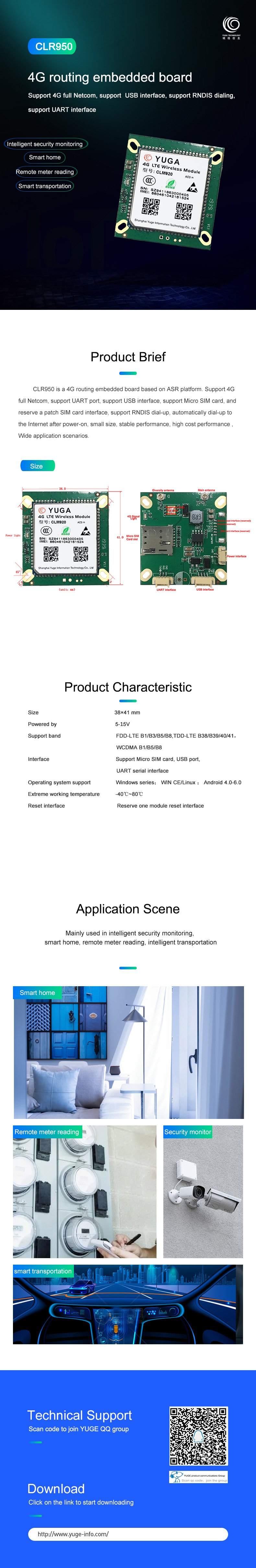 CLR950 is a 4G routing embedded board based on ASR platform. Support 4G full Netcom, support UART port, support USB interface, support Micro SIM card, and reserve a patch SIM card interface, support RNDIS dial-up, automatically dial-up to the Internet after power-on, small size, stable performance, high cost performance , Wide application scenarios.