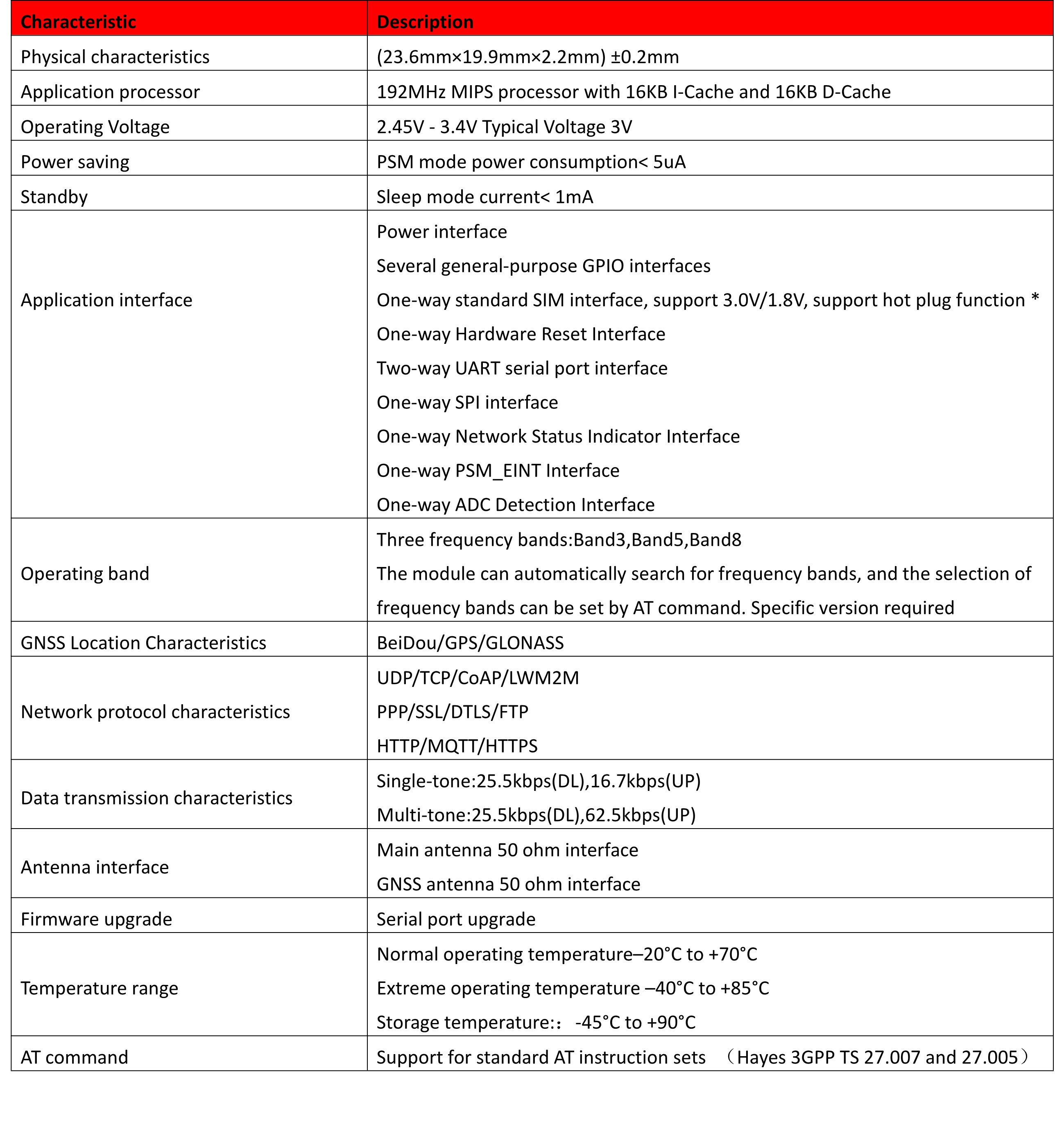 The LPM2100 bt is a multi-band NB-IoT module. The bt module supports the B3, B5, and B8 bands. It is mainly used for low-power data transmission services and GNSS positioning to meet the 3GPP Release 13 standard. The module has a total of 98 pins. At the same time, it has an ultra-small size of (23.6±0.15) mm × (19.9±0.15) mm × (2.2±0.2)mm, which can meet almost all M2M requirements.