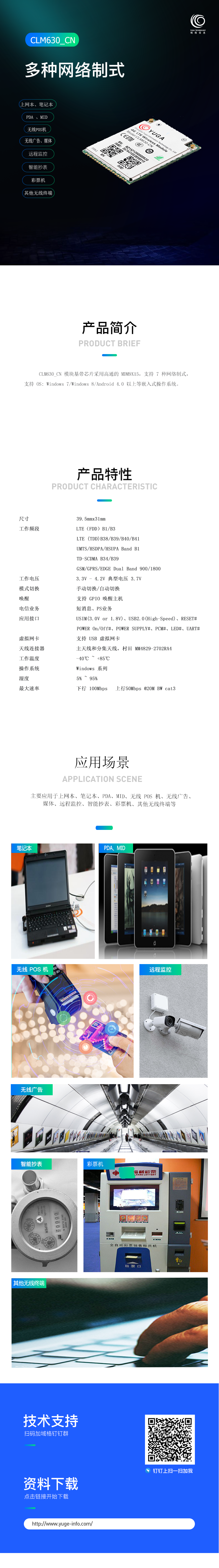 CLM630-CN模塊是4G模塊,基帶芯片采用高通的MDM9X15,支持7種網絡制式,支持OS: Windows 7/Windows 8/Android 4.0 以上等嵌入式操作系統。