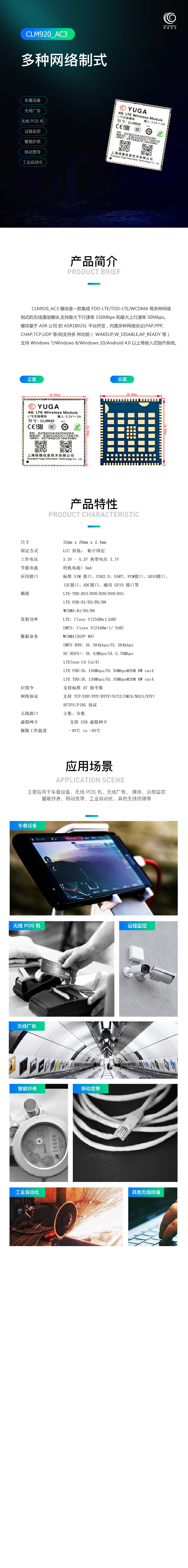 CLM920_AC3 模塊是一款集成 FDD-LTE/TDD-LTE/WCDMA 等多種網絡制式的無線通信模塊,支持最大下行速率 150Mbps 和最大上行速率 50Mbps。