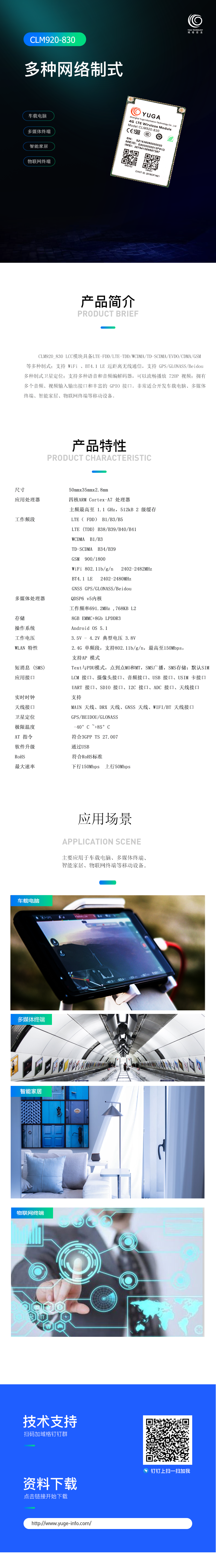 CLM920-830 LCC模塊具備LTE-FDD/LTE-TDD/WCDMA/TD-SCDMA/EVDO/CDMA/GSM 等多種制式;支持 WiFi 、BT4.1 LE 近距離無線通信,支持 GPS/GLONASS/Beidou多種制式衛星定位;支持多種語音和音頻編解碼器,可以流暢播放 720P 視頻;擁有多個音頻、視頻輸入輸出接口和豐富的 GPIO 接口。非常適合開發車載電腦、多媒體終端、智能家居、物聯網終端等移動設備。