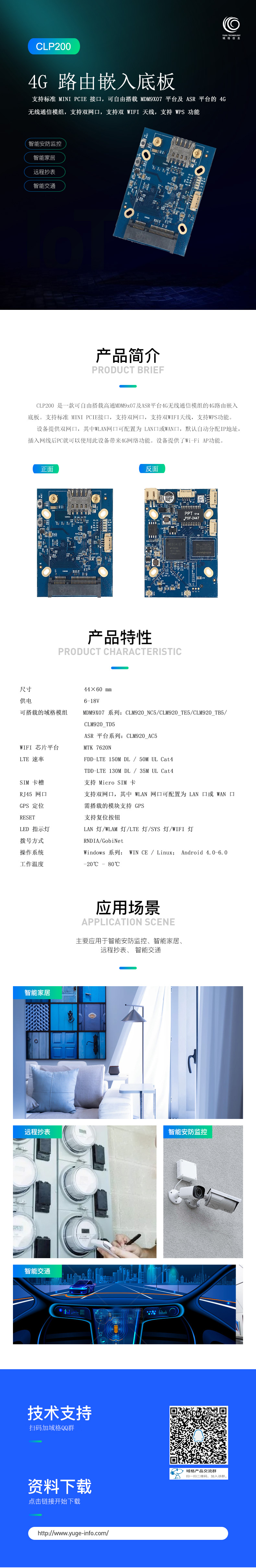 CLP200 是一款可自由搭載高通 MDM9x07 及 ASR 平臺 4G 無線通信模組的 4G 路由嵌入底板。 支持標準 MINI PCIE 接口, 支持雙網口, 支持雙 WIFI 天線, 支持 WPS功能。