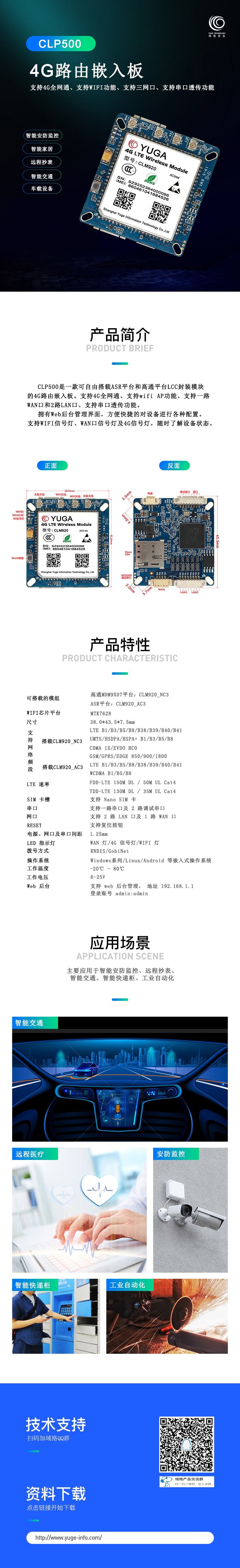 CLP500是一款可自由搭載ASR平臺和高通平臺LCC封裝模塊的4G路由嵌入板。支持4G全網通、支持wifi AP功能、支持一路WAN口和2路LAN口、支持串口透傳功能。擁有Web后臺管理界面,方便快捷的對設備進行各種配置。支持WIFI信號燈、WAN口信號燈及4G信號燈,隨時了解設備狀態。